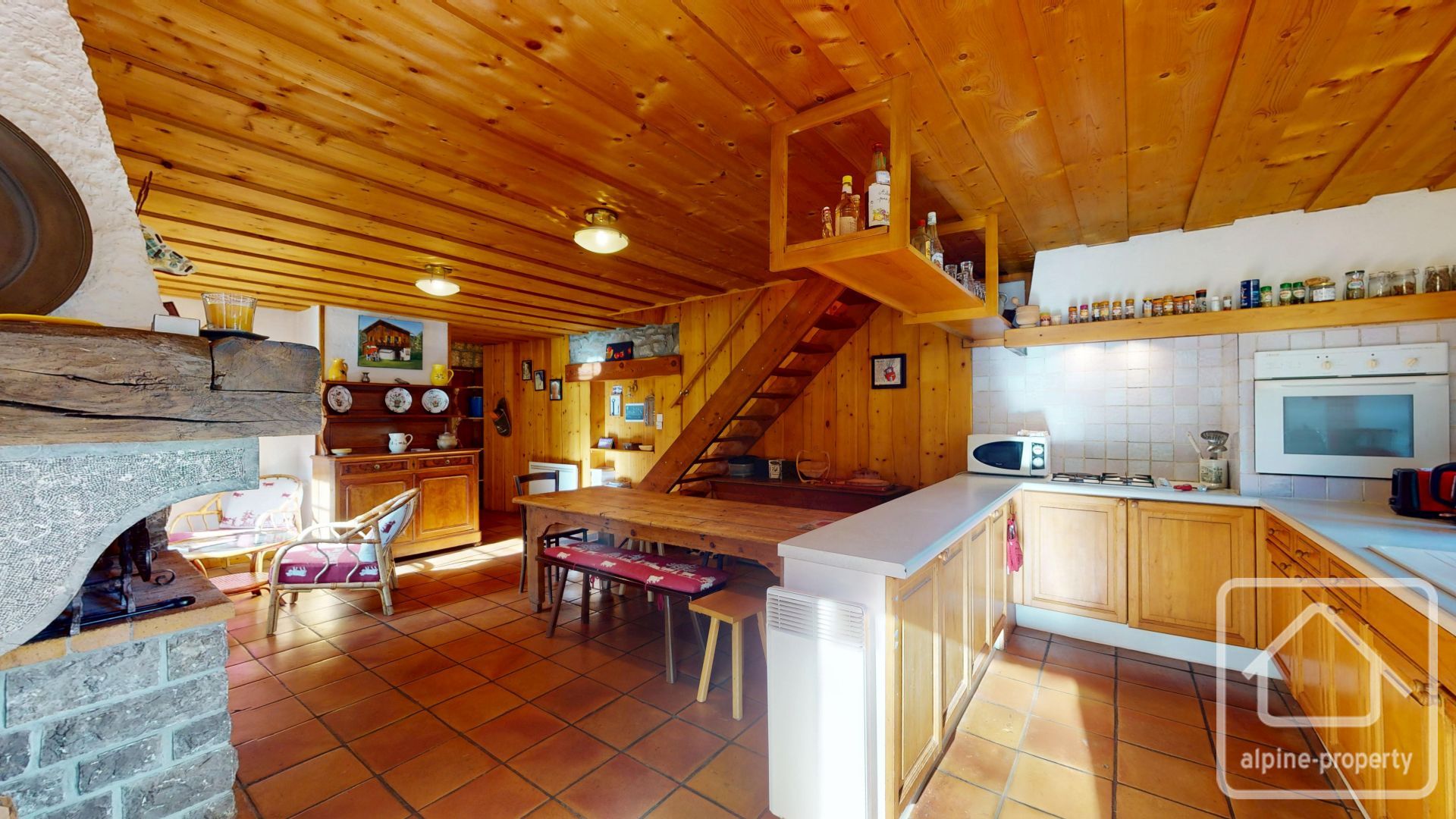 The existing home, which was fully renovated in 1981, offers approximately 101 m² of living space and is currently arranged over three floors. **On the ground floor**, a warm and welcoming living area features an open kitchen and dining space with a traditional fireplace and a period bread oven — a charming nod to its agricultural past. There is also an independent WC and a storage area on this floor. **Upstairs**, the chalet includes three bedrooms, a south-facing balcony, a shower room, an independent WC and an additional storage room, while the **top floor** provides two further bedrooms and a second shower room.
