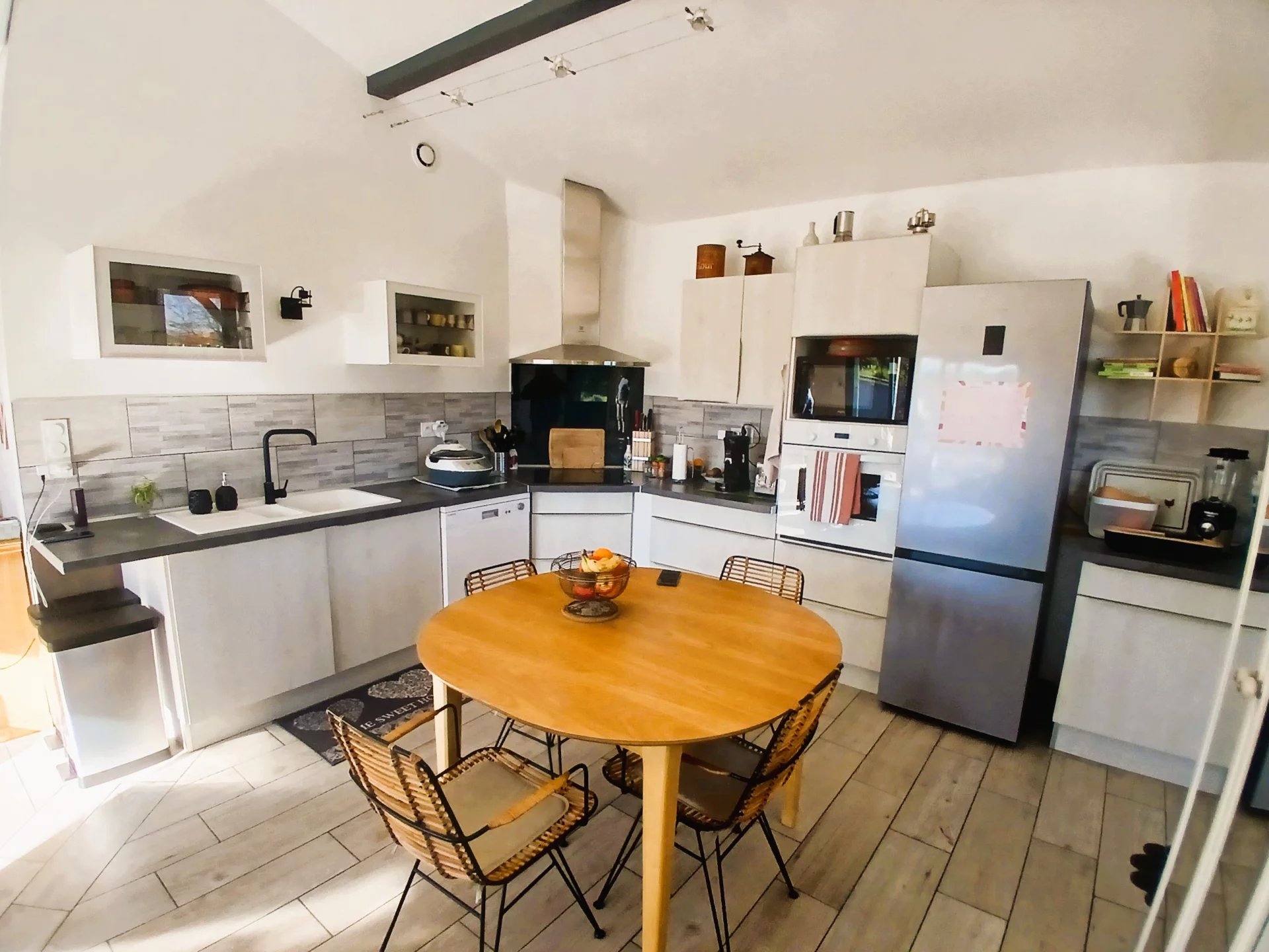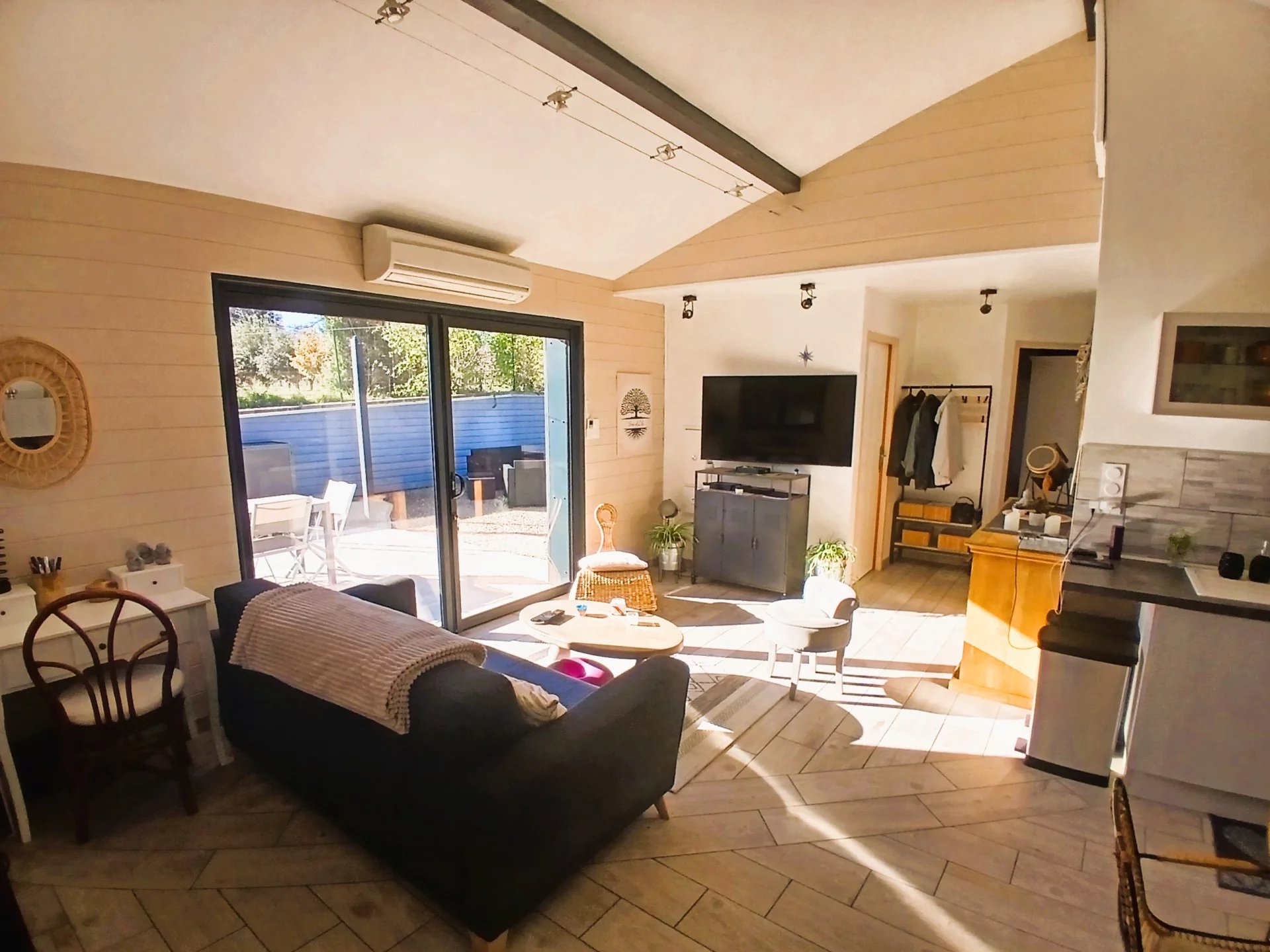 This charming single-storey timber-frame house, built in 2017, offers a wonderfully bright living space with an open-plan kitchen. Large pocket sliding doors open fully into the walls, giving direct access to the south-facing terrace and creating a seamless flow between indoors and outdoors. The main house includes two bedrooms, a modern bathroom and a separate toilet.