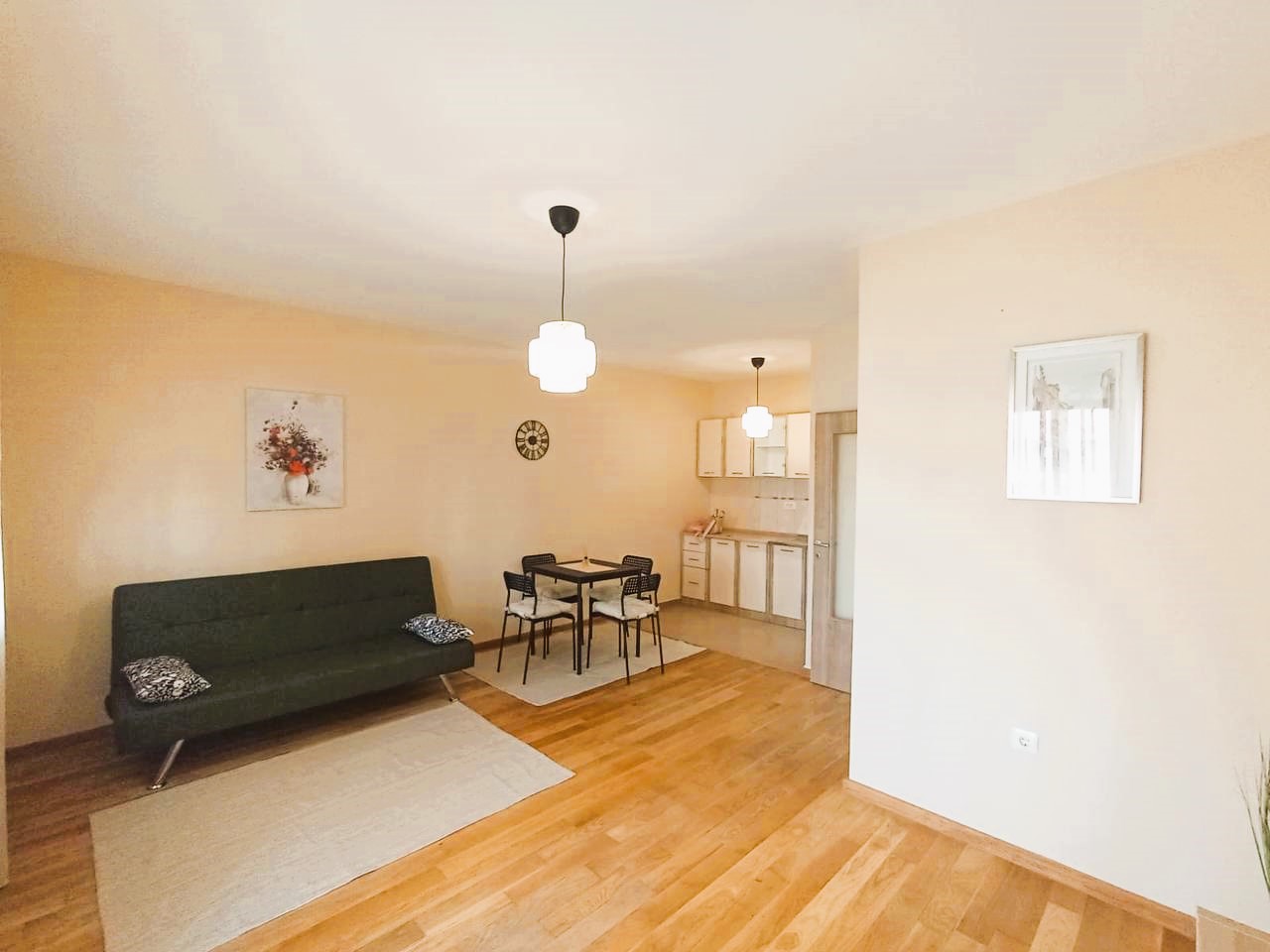- Open-plan living room with kitchen and dining area