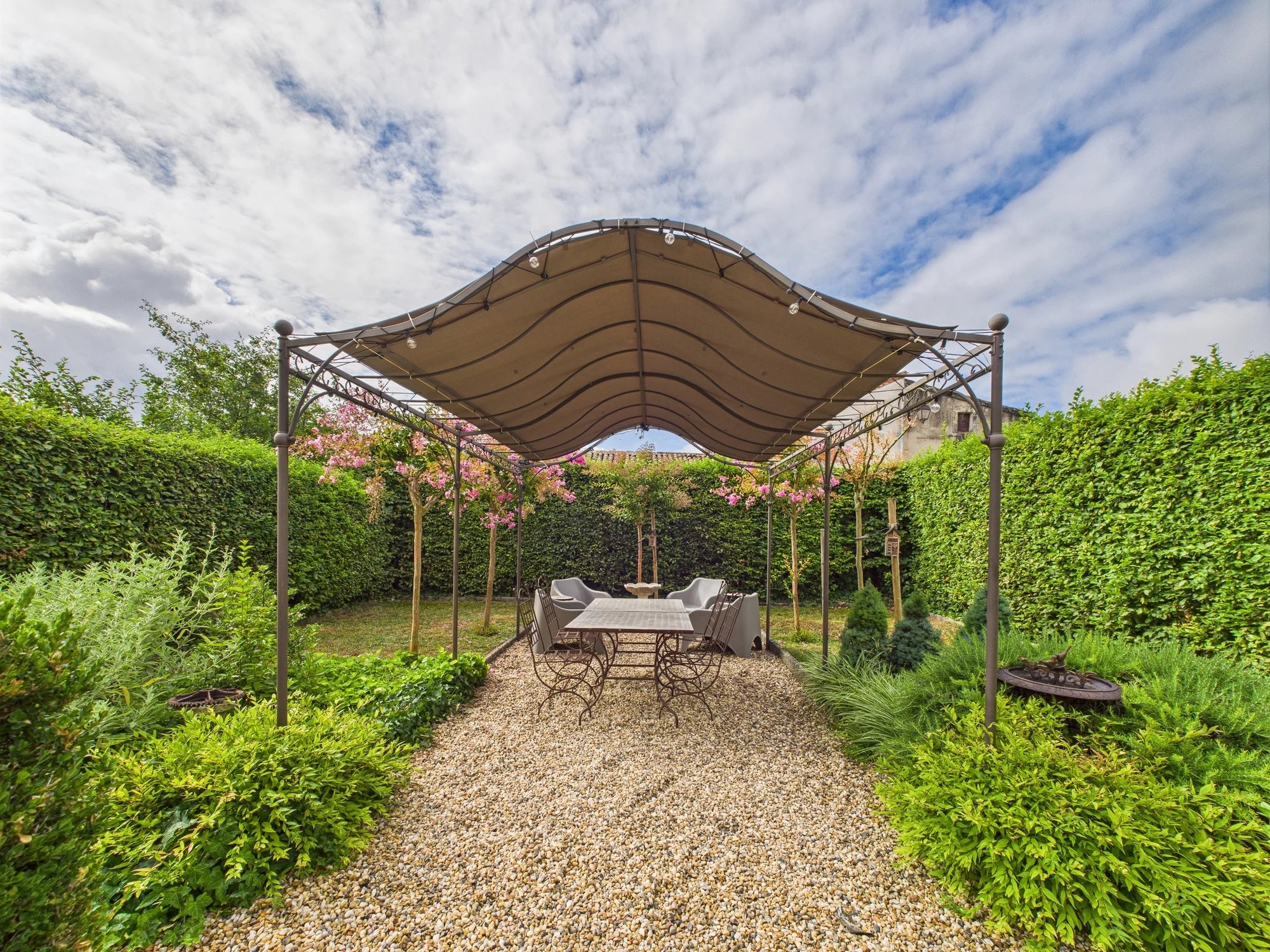 Behind the gate, a peaceful and very private garden provides the perfect setting for outdoor living, complete with a shaded dining pavilion and a terrace ideal for quiet afternoons under the maple tree. Step inside the house to find a cool, stone-floored living space filled with character: French doors open onto the garden, light floods through south-facing windows, and original features such as limestone walls, ancient beams and a grand open fireplace create a warm and welcoming atmosphere.