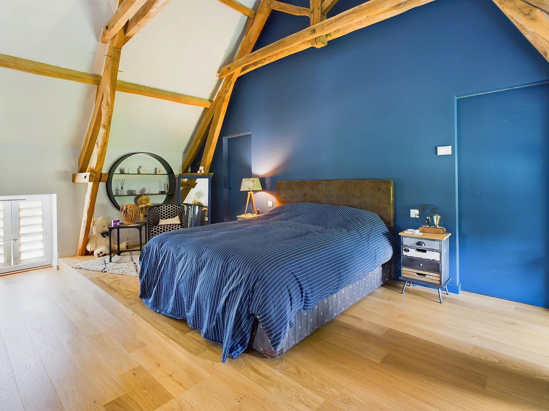 The main residence, a former stone barn, has been thoughtfully redesigned to provide a spacious living environment. On the ground floor, you’ll find a contemporary, open-plan kitchen and living area, along with two large bedrooms, each with a private shower room and independent external access. Upstairs, a 70 m² lounge with a wood-burning stove and lovely exposed oak beams leads to a third master suite which includes a beautifully appointed shower room and a walk-in dressing area.