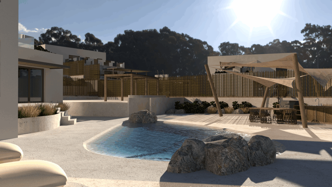 Each residence is thoughtfully designed with three spacious bedrooms and three modern bathrooms, offering comfort and convenience for families or guests. The properties are set on expansive 890 m² plots, ensuring privacy and ample outdoor space. A 50 m² pool complements each home, providing the perfect spot to relax, entertain, and enjoy the Mediterranean sun.