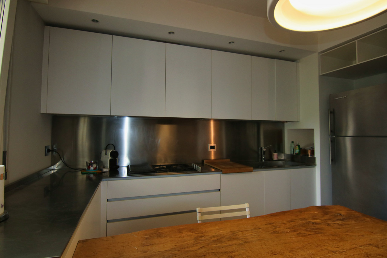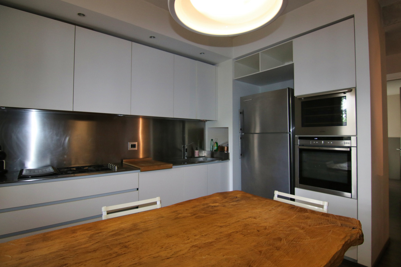 Then listen carefully: the apartment is fully furnished with serious stuff. The kitchen is a jewel, with a steel top, Foster burners, Liebherr fridge, NEF oven with retractable door, wine cellar, NEF dishwasher. It’s not market stuff, eh. The sleeping area is also equipped: double bed with Flou container, built-in wardrobes with sliding doors and chests of drawers. The living room has a Flexform corner sofa and a custom-equipped wall. The bathroom? Elegant, with Corian furniture and chests of drawers.