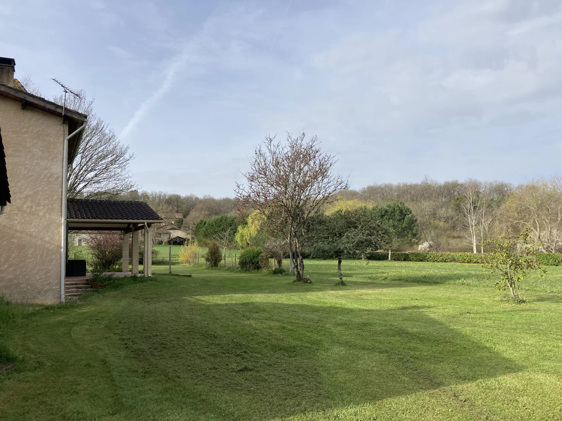 At a lower level the other part of the house with a large sitting room with terracotta tiles and beamed ceiling. Fireplace. Staircase going to two upstairs bedrooms and a large bathroom. Centrally heated. Fibre internet. Pretty garden and land of around 10000 m² around the property.