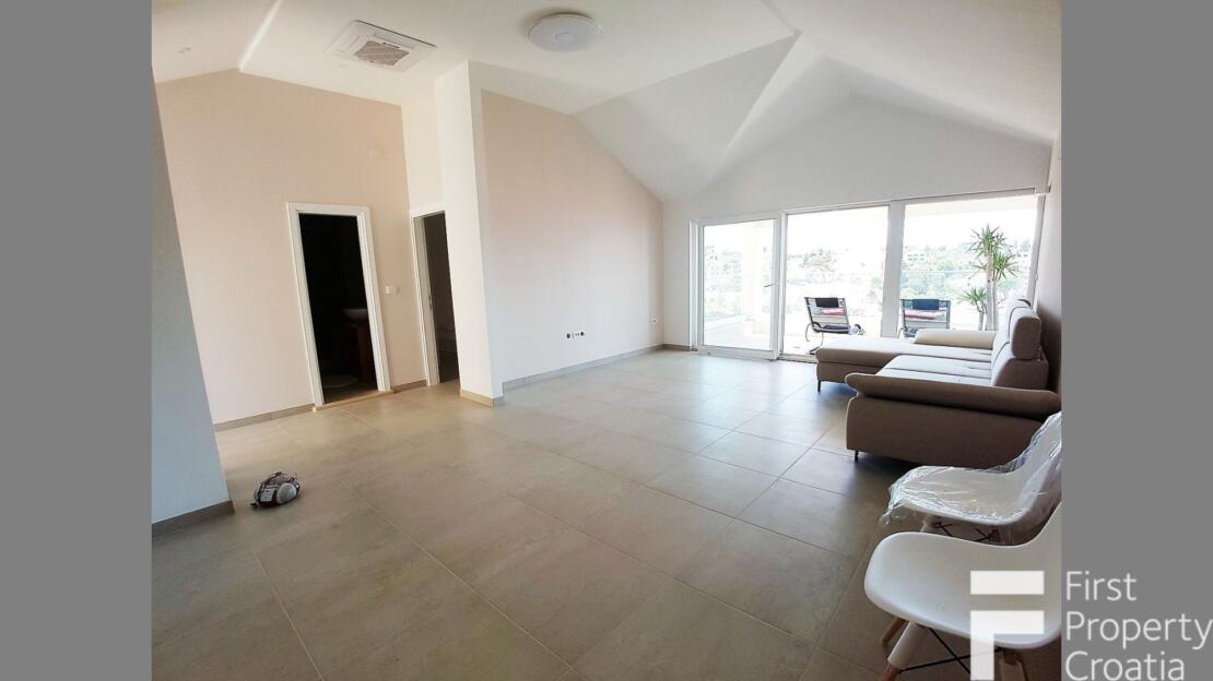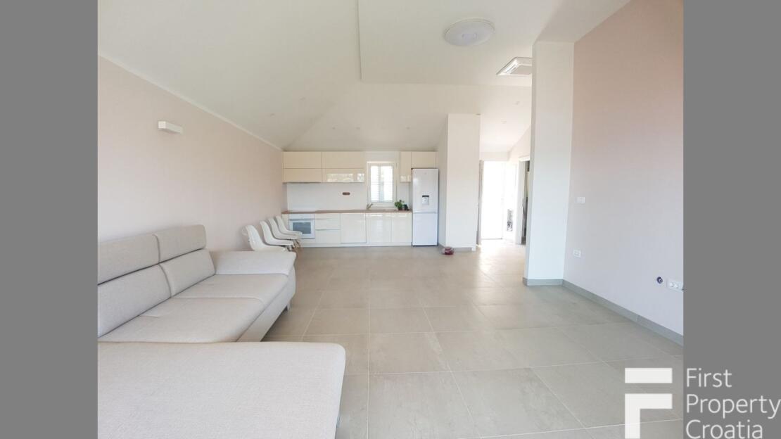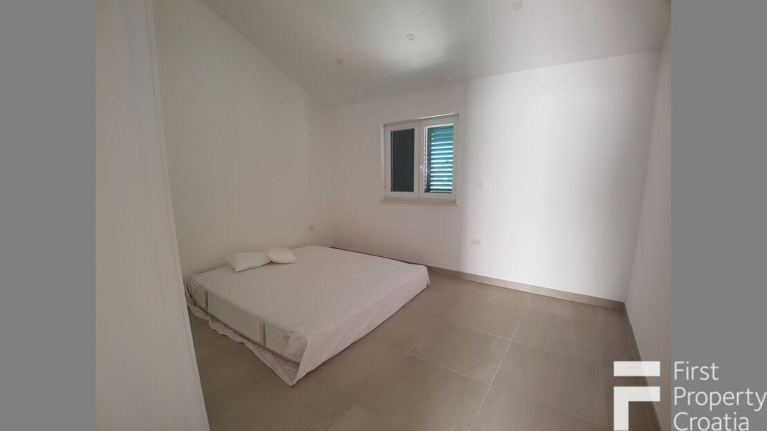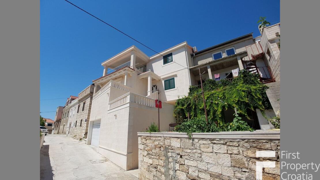 The property consists of three levels, divided into a ground floor, the first and second floor with a total internal living area of 164m2. The ground floor apartment has a 33m2 living area and it consists of a hallway, a storage space, a laundry room and a 8m2 terrace. The first floor has the surface of 71m2 and it consists of a hallway, one bathroom, three bedrooms, a kitchen and dining room area and a 7m2 terrace. The second floor has the surface of 60m2 and it is in an unfinished apartment where only the rough construction work is finished. That floor consists of a toilet, a bathroom, a kitchen, a living and dining area, two bedrooms and a 10m2 terrace. All bedrooms have parquet flooring, the rest of the rooms hase ceramic tiles and the terraces are covered in Brac white stone. The house also has a 32m2 garage on the ground floor level. All the furniture and appliances are included in the price of the property and that is a big advantage because it makes it possible to move in without additional expenses.