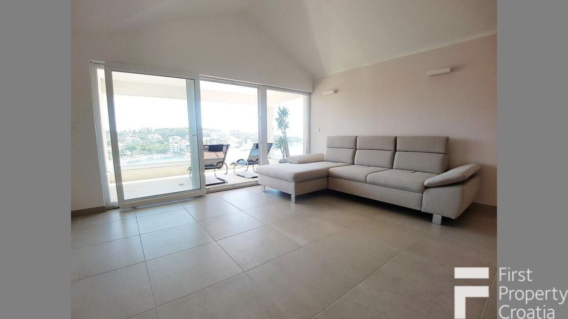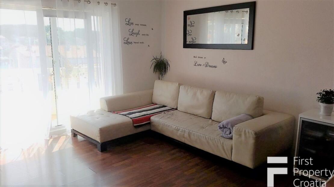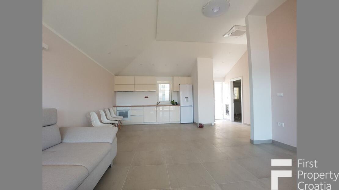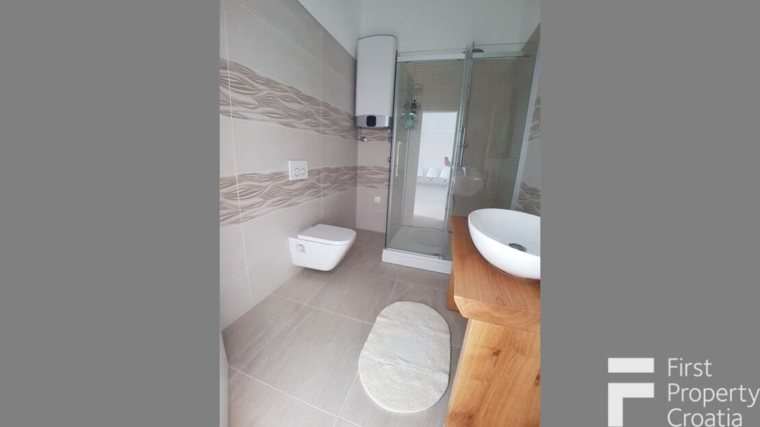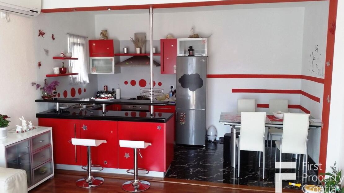 The property consists of three levels, divided into a ground floor, the first and second floor with a total internal living area of 164m2. The ground floor apartment has a 33m2 living area and it consists of a hallway, a storage space, a laundry room and a 8m2 terrace. The first floor has the surface of 71m2 and it consists of a hallway, one bathroom, three bedrooms, a kitchen and dining room area and a 7m2 terrace. The second floor has the surface of 60m2 and it is in an unfinished apartment where only the rough construction work is finished. That floor consists of a toilet, a bathroom, a kitchen, a living and dining area, two bedrooms and a 10m2 terrace. All bedrooms have parquet flooring, the rest of the rooms hase ceramic tiles and the terraces are covered in Brac white stone. The house also has a 32m2 garage on the ground floor level. All the furniture and appliances are included in the price of the property and that is a big advantage because it makes it possible to move in without additional expenses.