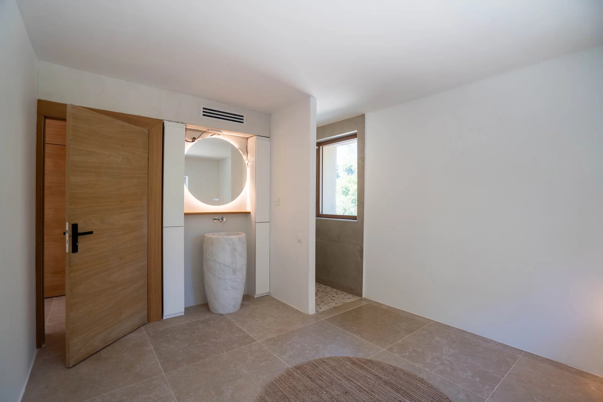 With no overlooking neighbors, the house immediately welcomes you into a bright living space opening onto a spacious terrace. The main level also includes a kitchen, a guest toilet, a master suite with shower room, and a second bedroom with its own shower room.