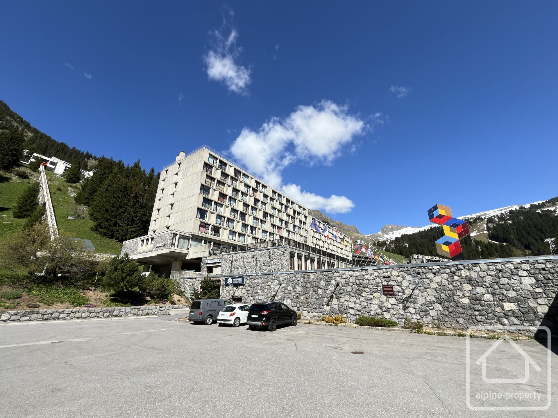 Built in the heart of a vast natural amphitheatre reaching 2,500 metres in altitude, Flaine is renowned as a snow-sure resort – a delight for skiers – with its modernist architecture and monumental artworks by prestigious artists such as Picasso, Vasarely and Dubuffet, which can be admired from the apartment.