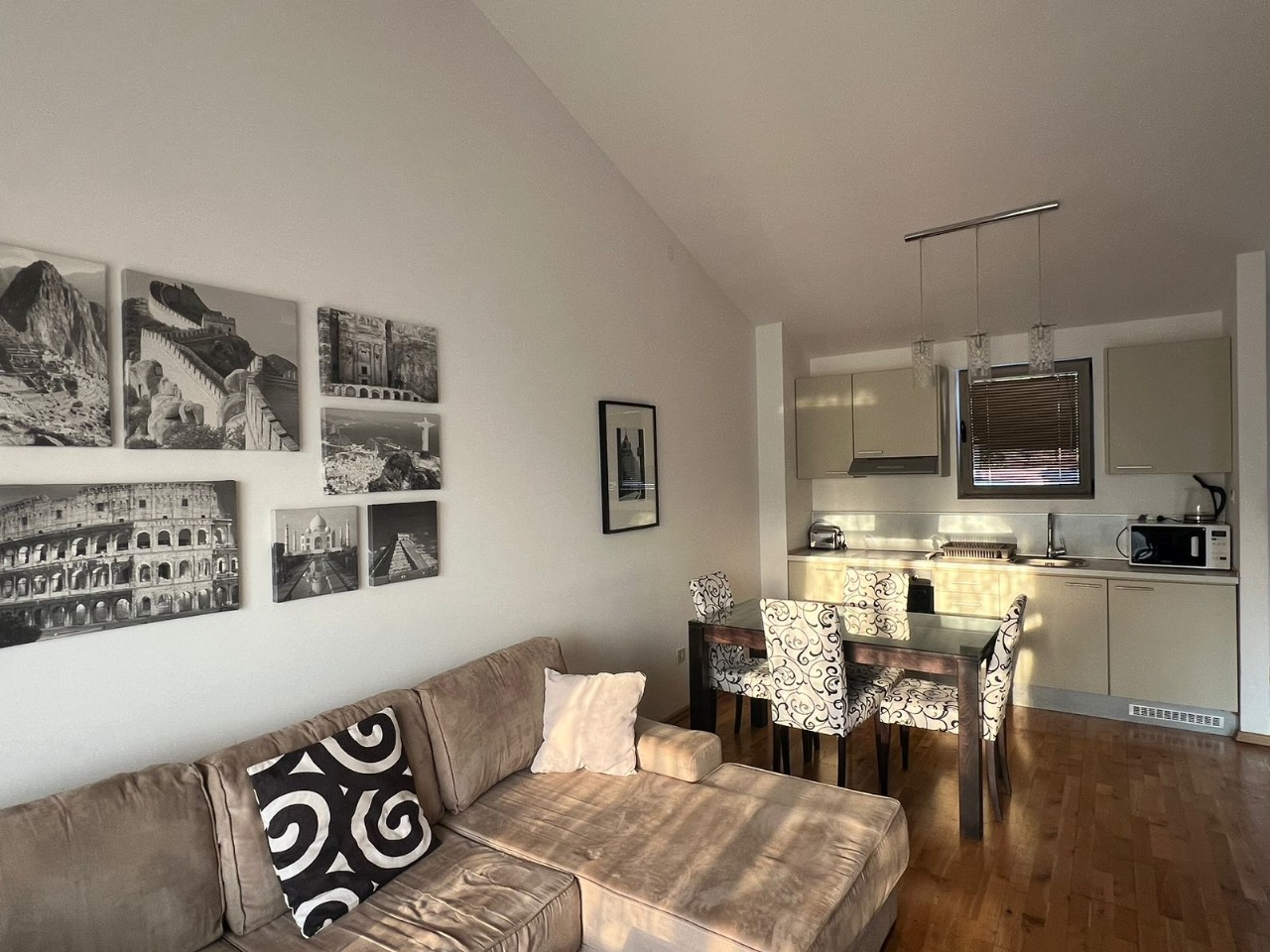 This cozy apartment is situated on the top floor of the complex, featuring high ceilings that create a spacious and airy ambiance. The open-plan design of the living room and kitchen adds to the modern feel of the home. The kitchen comes fully equipped with all necessary appliances, making it easy to settle in and start living right away. Additionally, a comfortable bedroom and a modern bathroom complete this charming space.