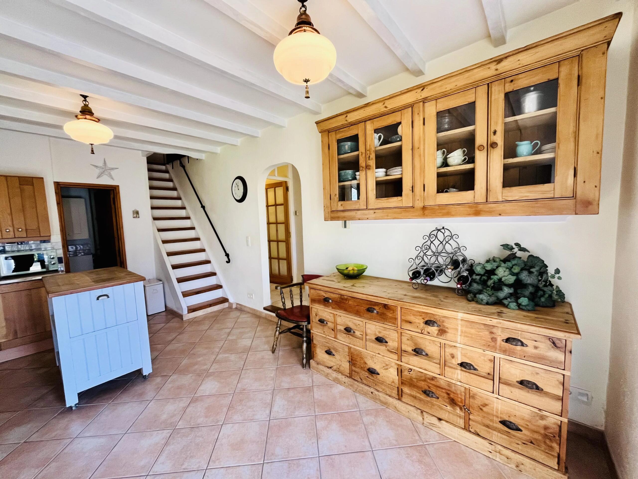 The ground floor features a bright lounge-dining room with a wood-burner, beams and windows to the front and side. A door opens to the covered terrace, perfect for morning coffee. The charming country-style kitchen, with oak doors and drawer fronts, also accesses the terrace and overlooks the rear garden. Off the kitchen is a useful utility-pantry, and stairs lead to the first floor. The hallway includes a practical office space and a sought-after ground-floor double bedroom, with a full bathroom opposite. A rear door leads to the garden, pool and a second gated entrance, ideal for extra parking.