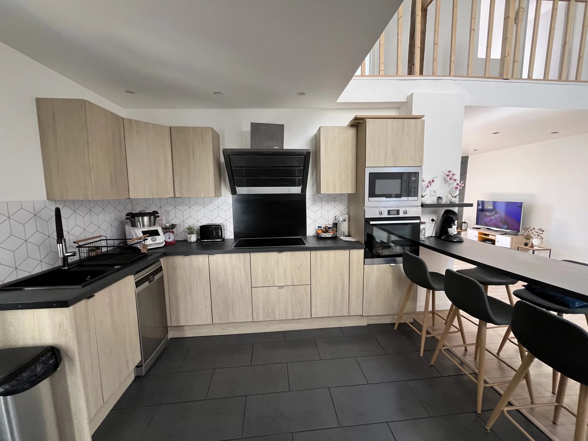 As you enter, you discover a large, light-filled living space, where the open-plan kitchen, dining room and lounge create a warm atmosphere. Upstairs are two bedrooms, a study and a shower room with toilet.
