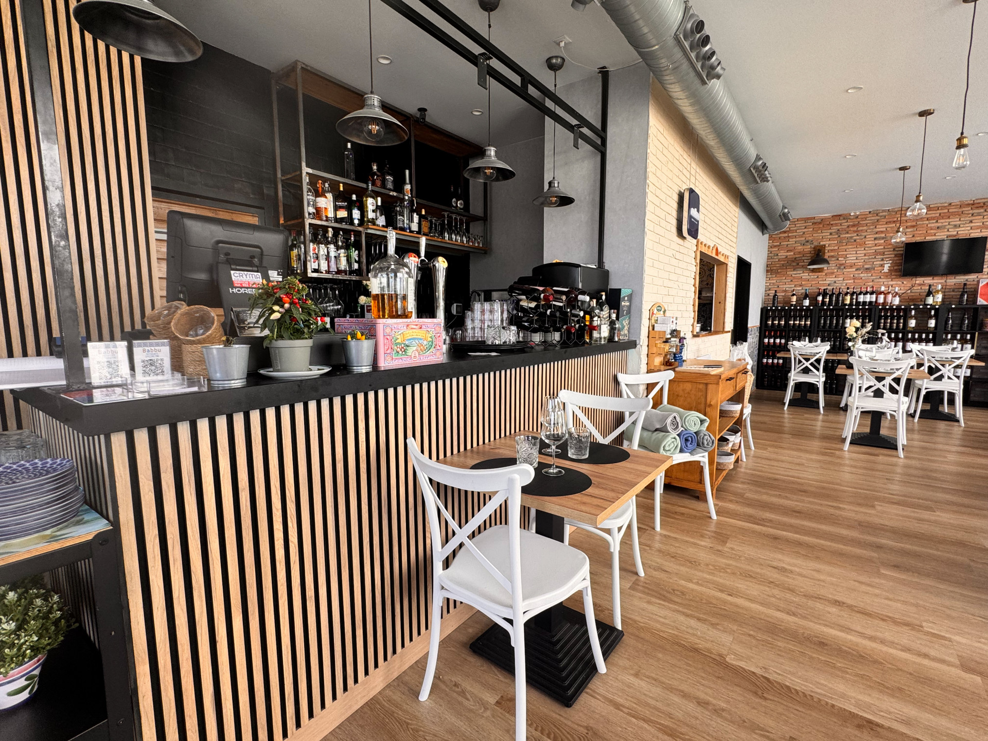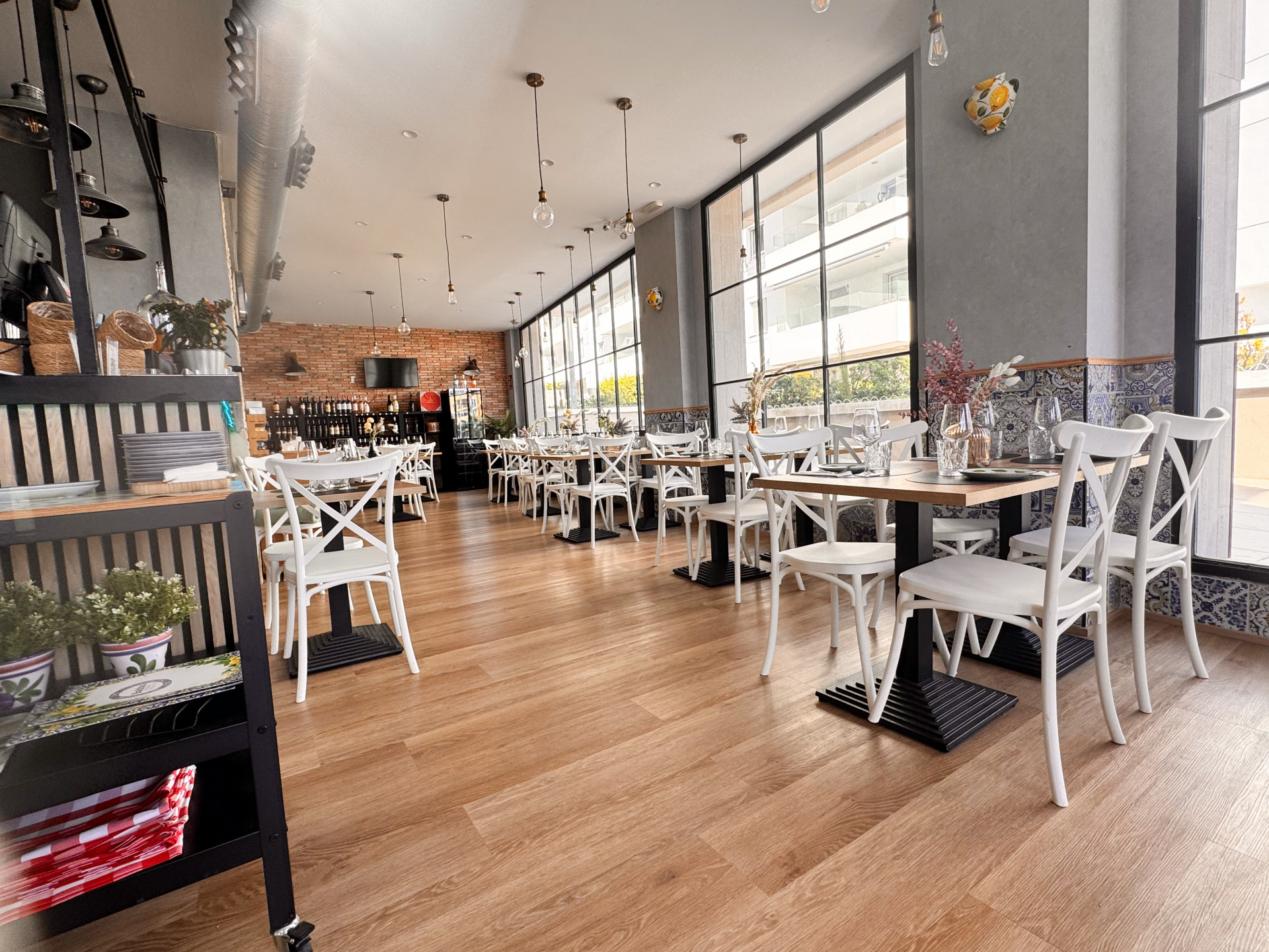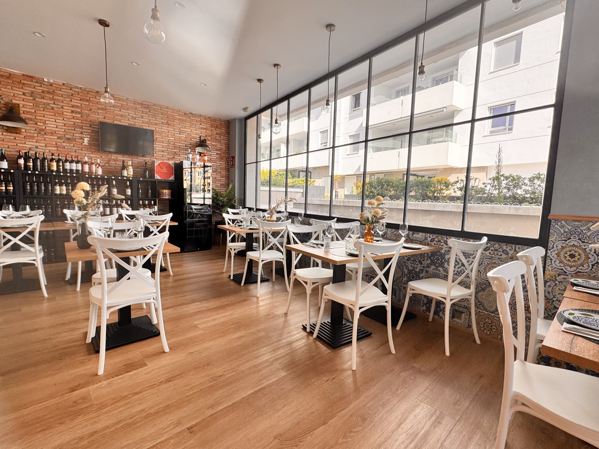 The interior is bright, elegant and inviting, with large windows that allow natural light to fill the room. The design blends warm wood, brick accents and Andalusian tiles, creating a stylish Mediterranean atmosphere. The dining area is fully furnished and includes comfortable seating, set tables, glassware, cutlery and decorative pieces—all included in the sale. The bar area features quality shelving, lighting, refrigeration and all the equipment necessary for smooth, professional service.