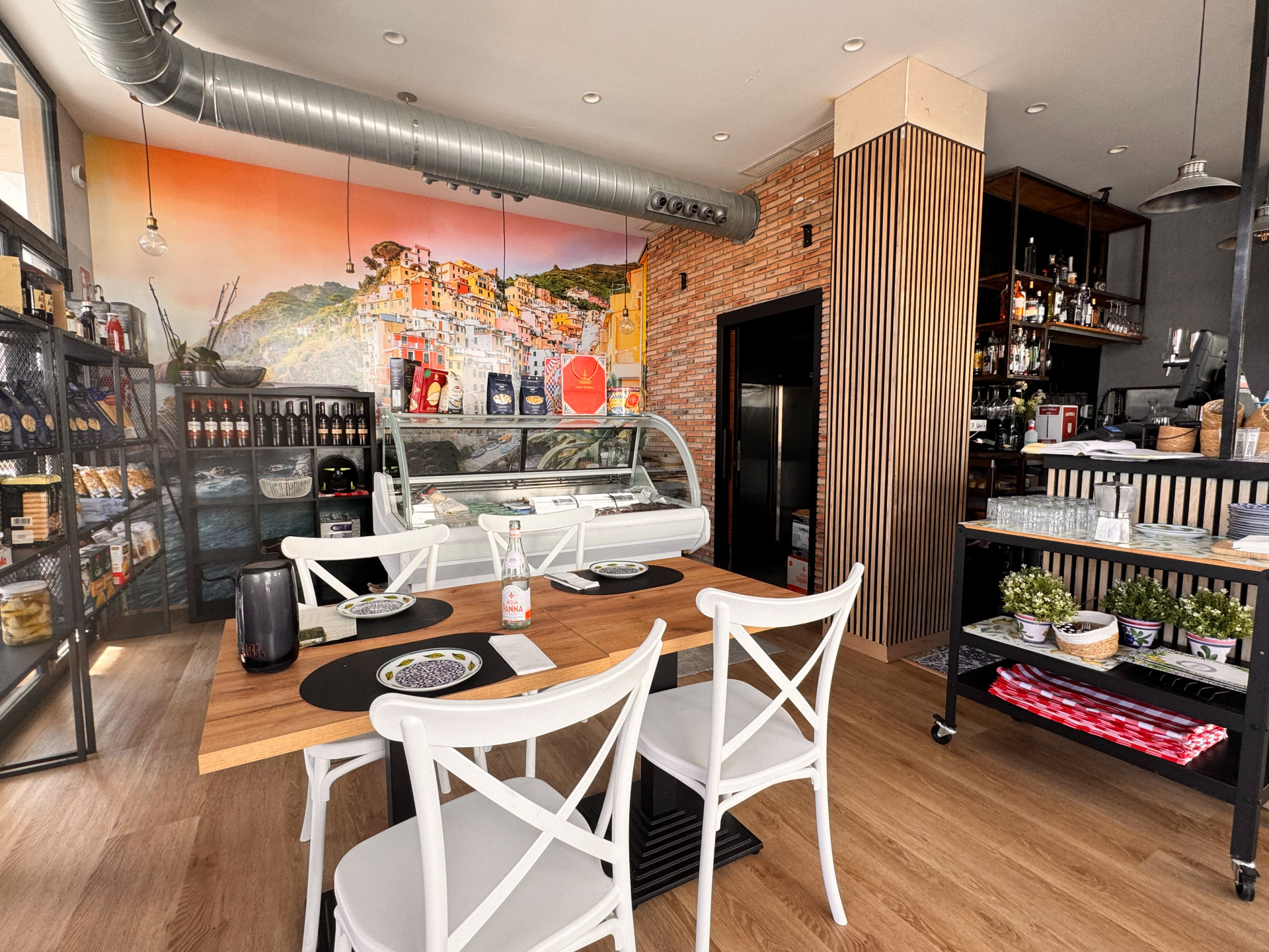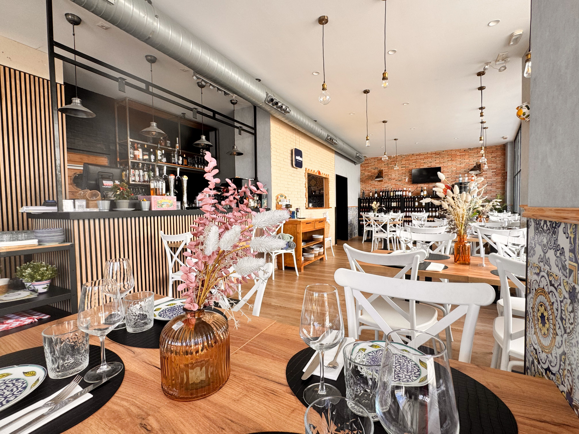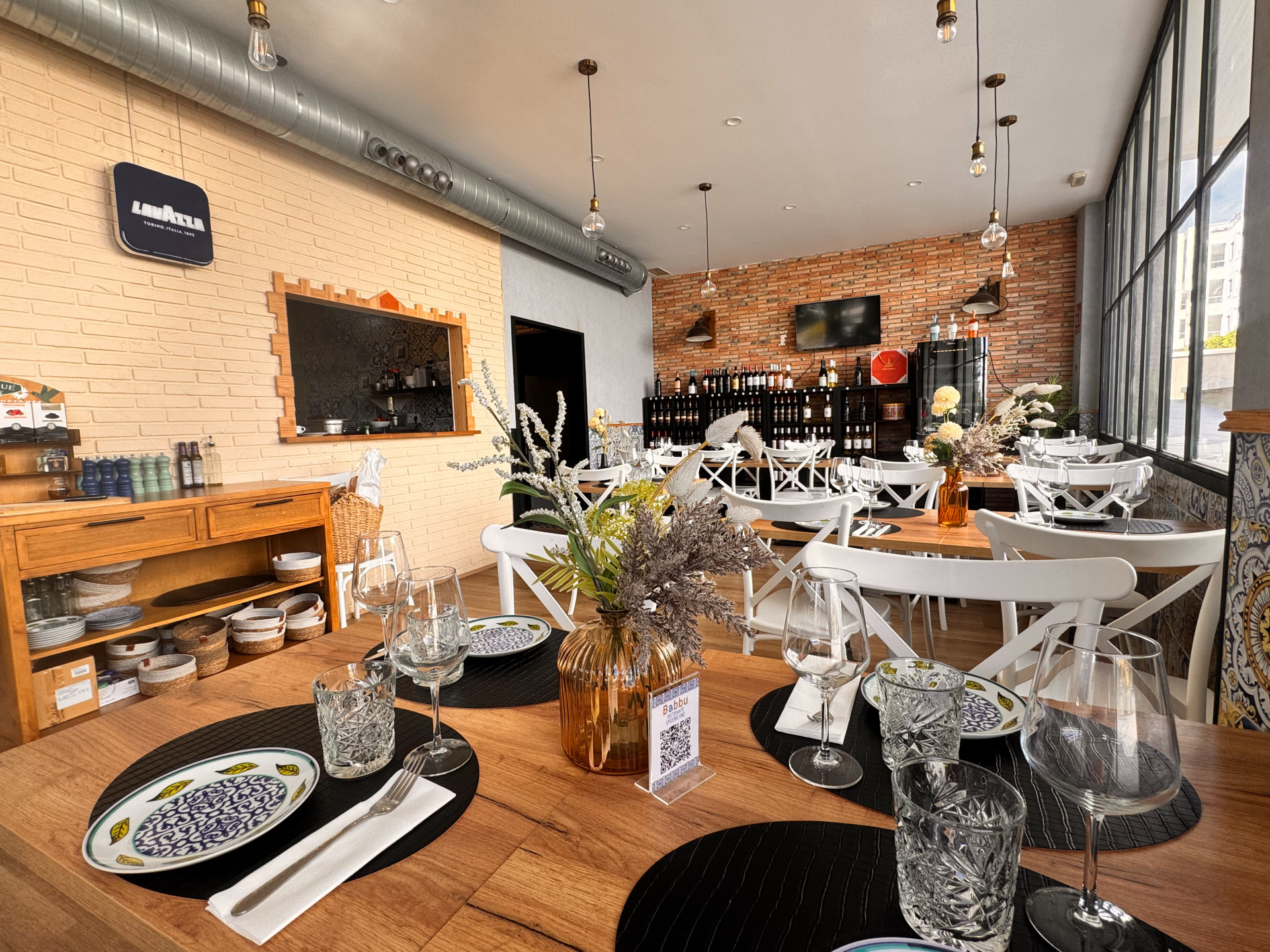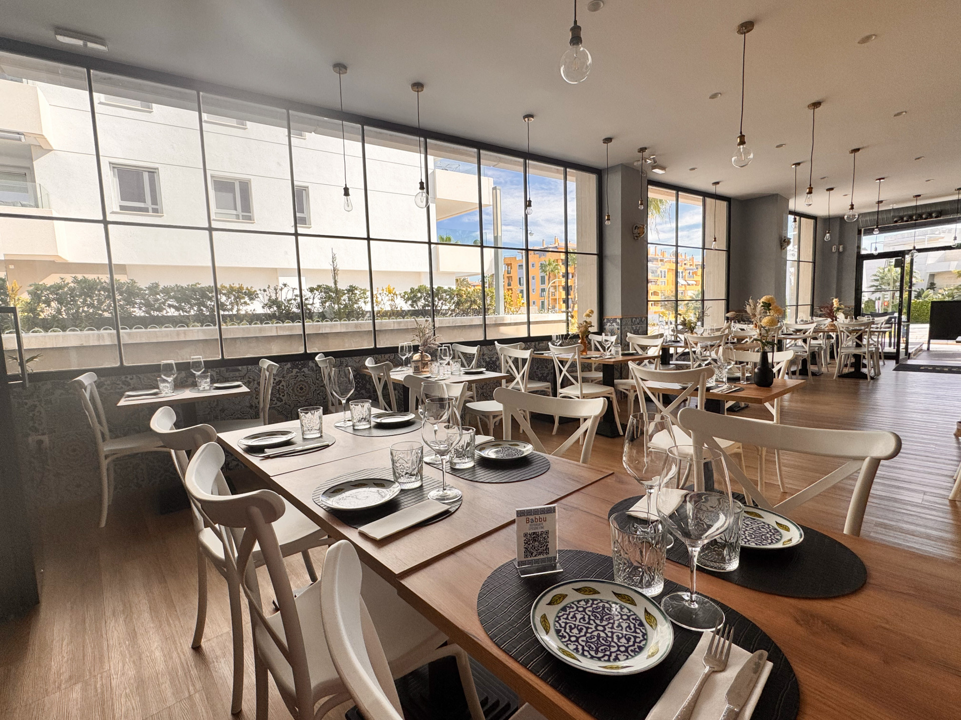 The interior is bright, elegant and inviting, with large windows that allow natural light to fill the room. The design blends warm wood, brick accents and Andalusian tiles, creating a stylish Mediterranean atmosphere. The dining area is fully furnished and includes comfortable seating, set tables, glassware, cutlery and decorative pieces—all included in the sale. The bar area features quality shelving, lighting, refrigeration and all the equipment necessary for smooth, professional service.