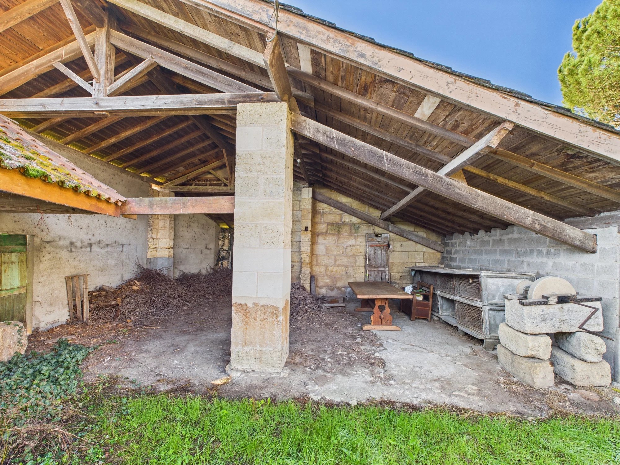 At the centre of the property stands a traditional stone house with six bedrooms and generous living spaces, awaiting sympathetic renovation. Full of authentic Girondine charm, it retains its original fireplaces, old beams and period details, offering the perfect canvas for a restoration that could blend heritage with comfort.