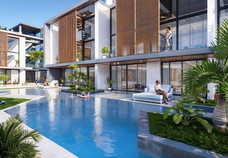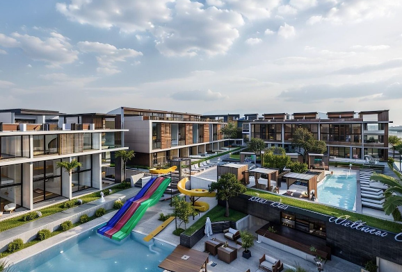 The development offers a wide array of amenities, including lush green areas, a welcoming cafe and restaurant, a fully equipped gym, and a convenient commercial area. Relax by the pool with a poolside bar, enjoy outdoor sports facilities, and take leisurely strolls along the walking paths. There is also an aquapark and children’s playground.