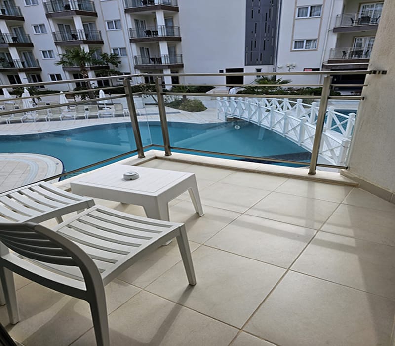 A fully furnished first floor Suite with a private balcony enjoying a pool and sea view