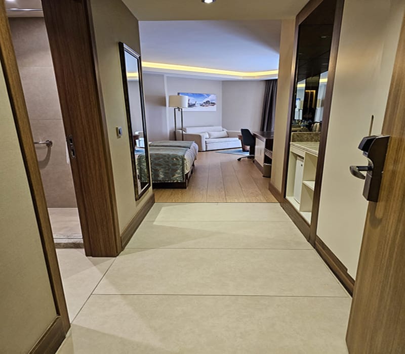 This fully furnished Suite is all in one room. It offers twin beds, a seating area with a sofa and coffee table, a large built-in unit/work desk along the back wall and plenty of storage. There is also a modern fully tiled bathroom complete with a walk-in shower.
