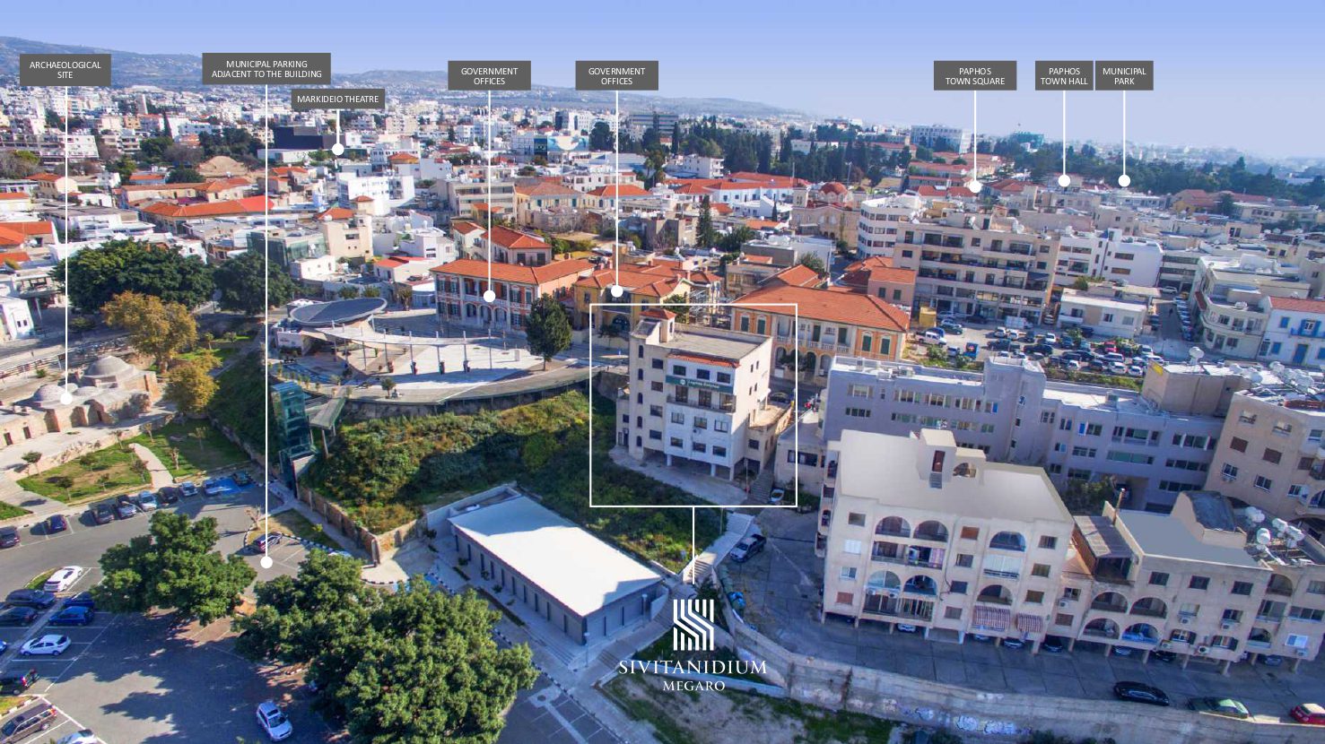 is ideally located at the hub of the business centre of Paphos and presents a unique opportunity to secure a prestigious, self-contained office building in an area that has seen major investment and regeneration in recent years. The building is positioned adjacent to the municipal market and parking grounds, main high street, government offices, banks, law firms, accountancy practices, architectural and engineering services, other major businesses, and an extensive range of shops and restaurants within easy walking distance.
