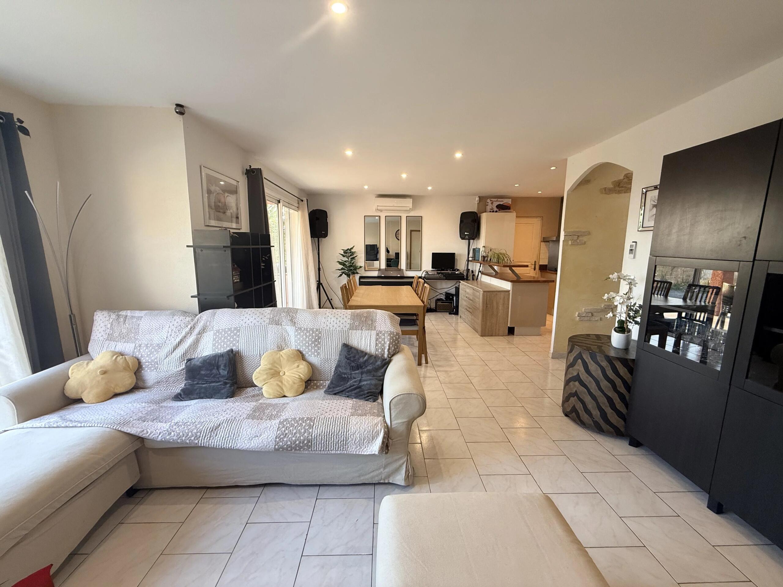 This single-storey house is located in a peaceful village on its own plot of approximately 988 mยฒ in Villepinte, just 15 minutes from the famous city of Carcassonne and Castelnaudary. The property consists of a main house with an open living space, a fully equipped kitchen, 3 bedrooms, a bathroom, and a garage. A sunny Mediterranean-style courtyard with a covered terrace for meals and a barbecue area. The living room opens onto a south-facing terrace. A large garage with a workshop and plenty of parking completes the property. The rest of the grounds are easy to maintain, with lawns and plantings of trees and shrubs. The house has its own security system with motion detectors and cameras.