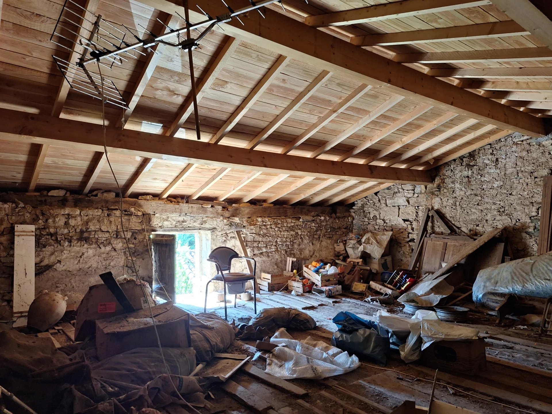 Located a short drive from the historic village of Charroux with its shops and cafés, is this super little project to do up. A terraced stone house comprising a kitchen with an 18th century fireplace and a small corner sink. This room could be enlarged as the adjoining room has been used as a bedroom with brick partition inbetween. To the rear of the ground floor is a second bedroom and a toilet. Currently there is no bathroom or known drainage system. The attic, accessed by stairs, offers the potential to expand into this floor area, subject to permissions. On the ground floor there is a door opening onto the rear garden, currently unfenced. There is also an overgrown plot of land with a hangar / car port opposite the house. With a bit of love and investment this could be a delightful home either as a main residence or an ideal holiday base.