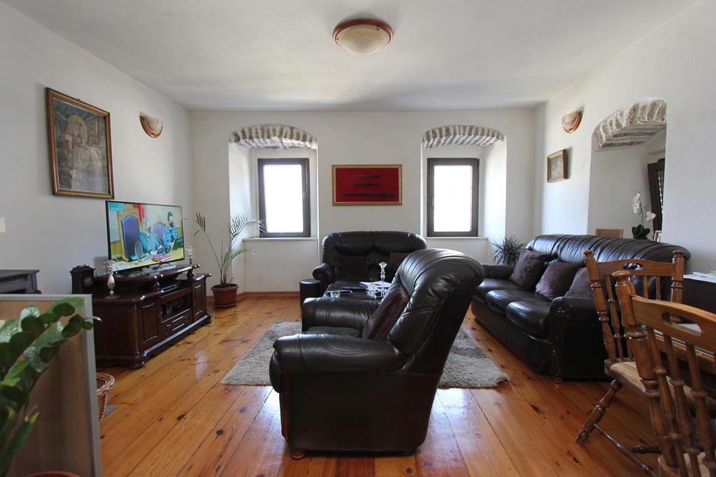 The second and third floors of the house are a 60 m2 duplex apartment. On the first level (second floor) there is a kitchen combined with a living room and a bathroom. On the second level (third floor) there are three small bedrooms and a bathroom.