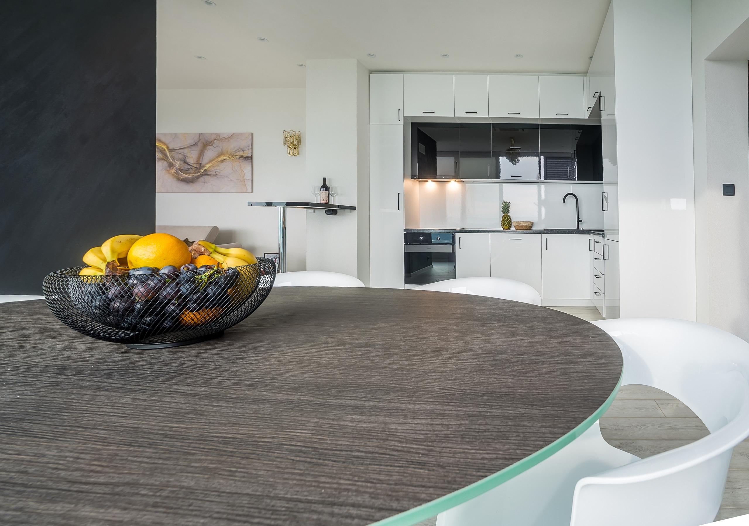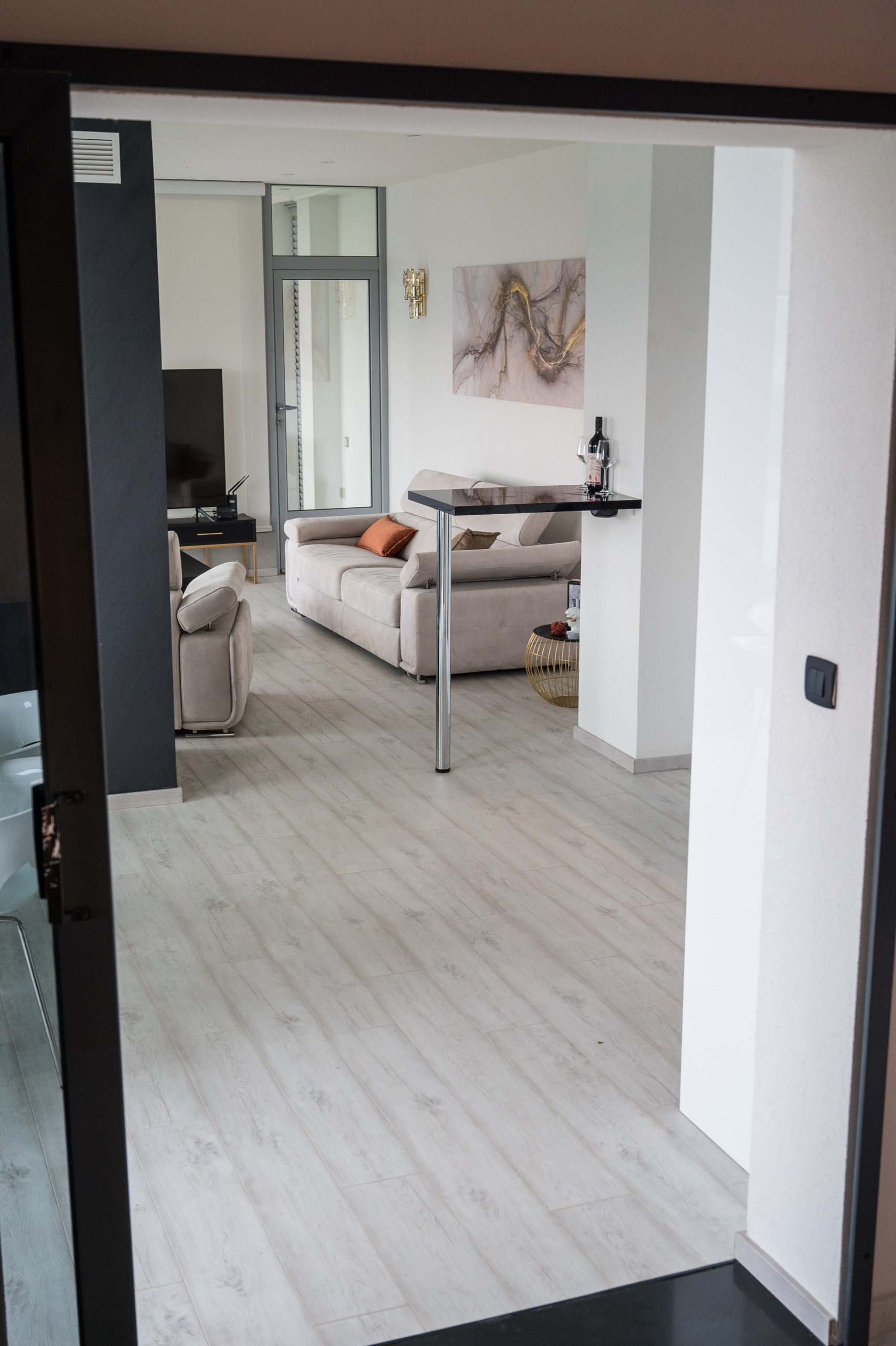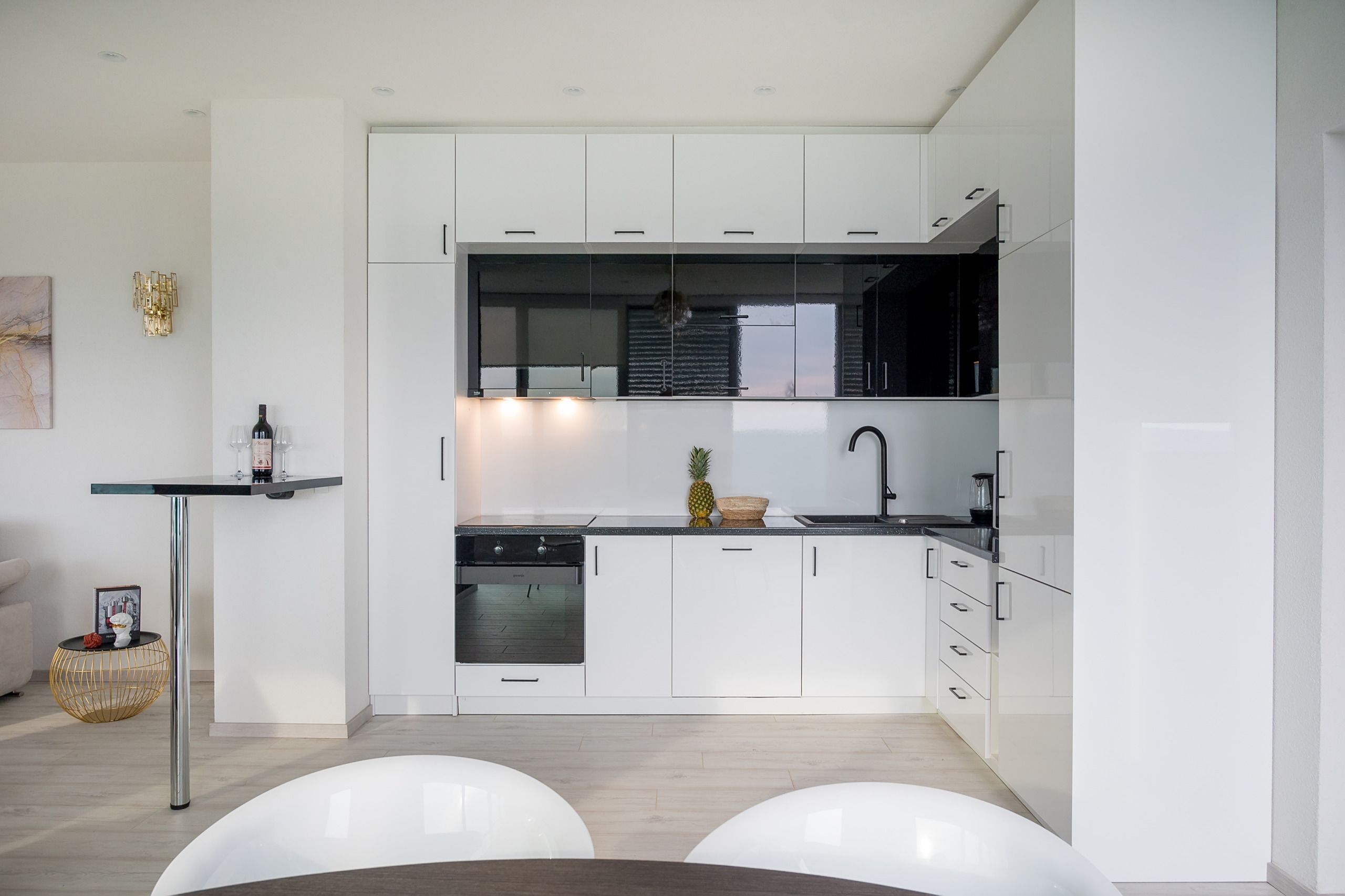 - Living Area: Open-plan living room and kitchen with modern finishes.