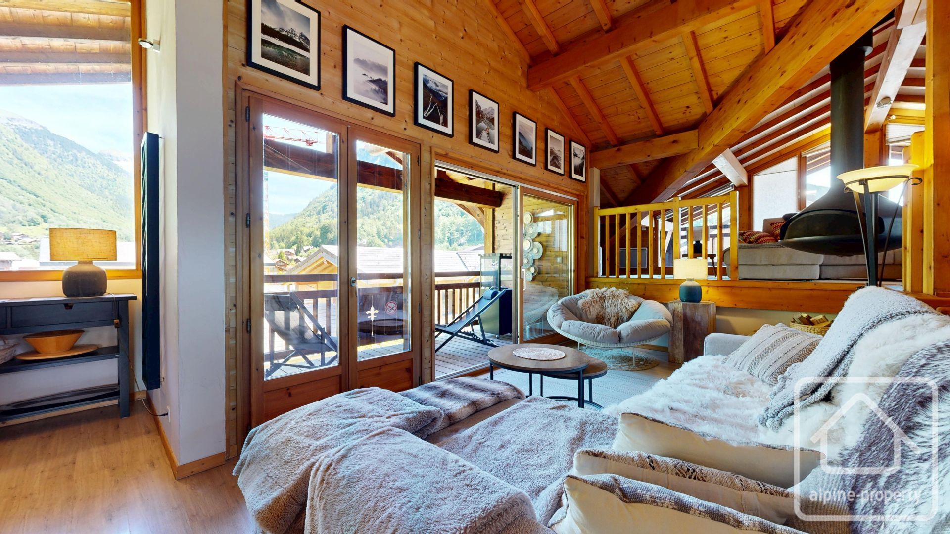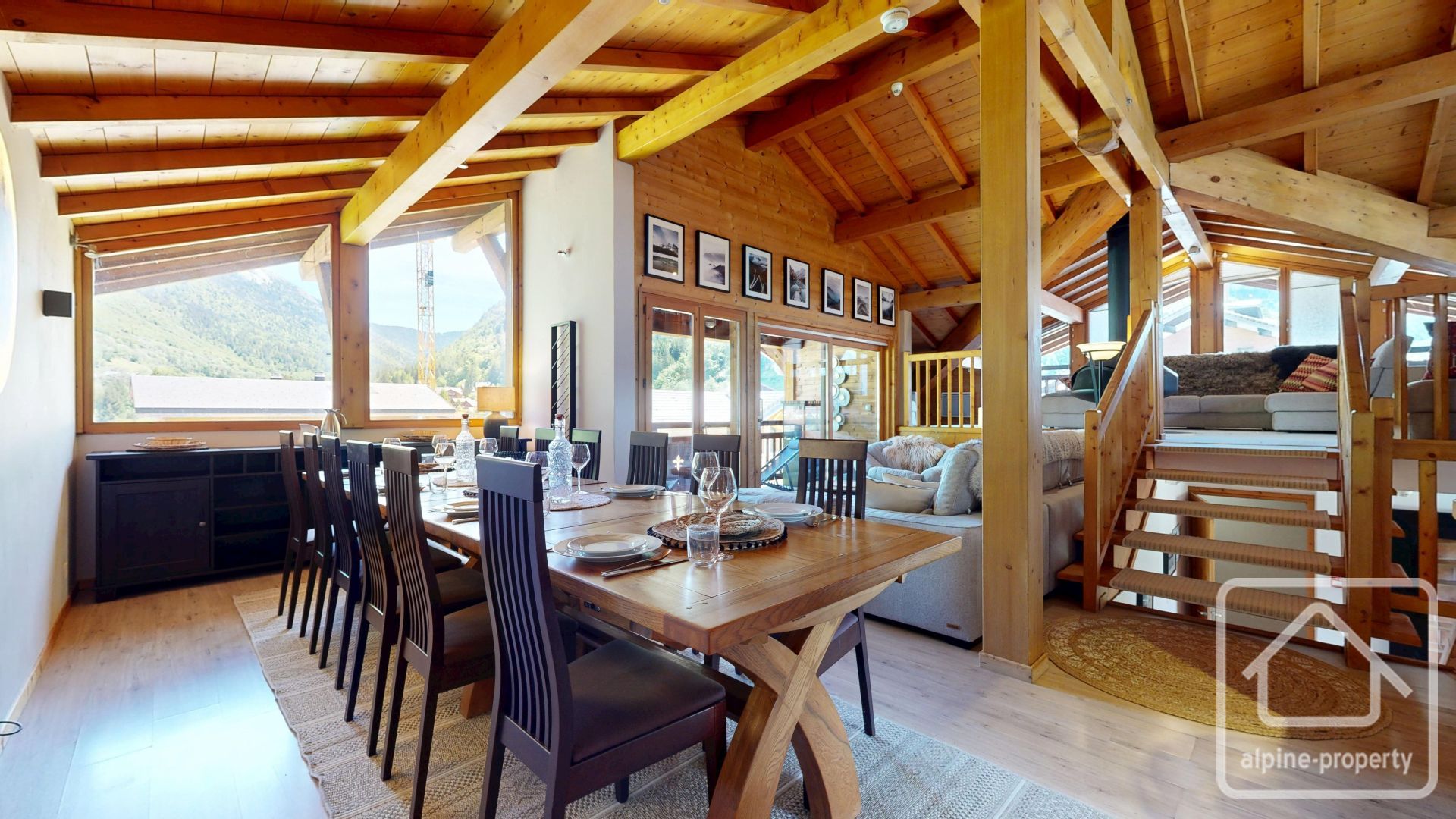 Inside, the chalet features a spacious, light-filled open-plan living area with vaulted ceilings, warm timber finishes, and a striking suspended log burner as the centrepiece. Large picture windows and French doors lead out to a number of terraces, one with a jacuzzi, and all ideal for soaking in the panoramic mountain views. A separate kitchen serves the superb dining area that can comfortably seat all guests for convivial moments around the table.