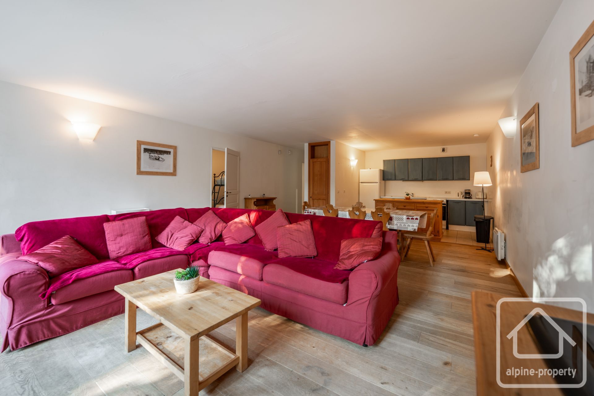 Entrance, spacious open plan kitchen/living/dining room, guest toilet, one double bedroom with shared ensuite access to bathroom with a second double bedroom, both with views across the garden towards the Brévent, family bathroom with bathtub, third double bedroom.